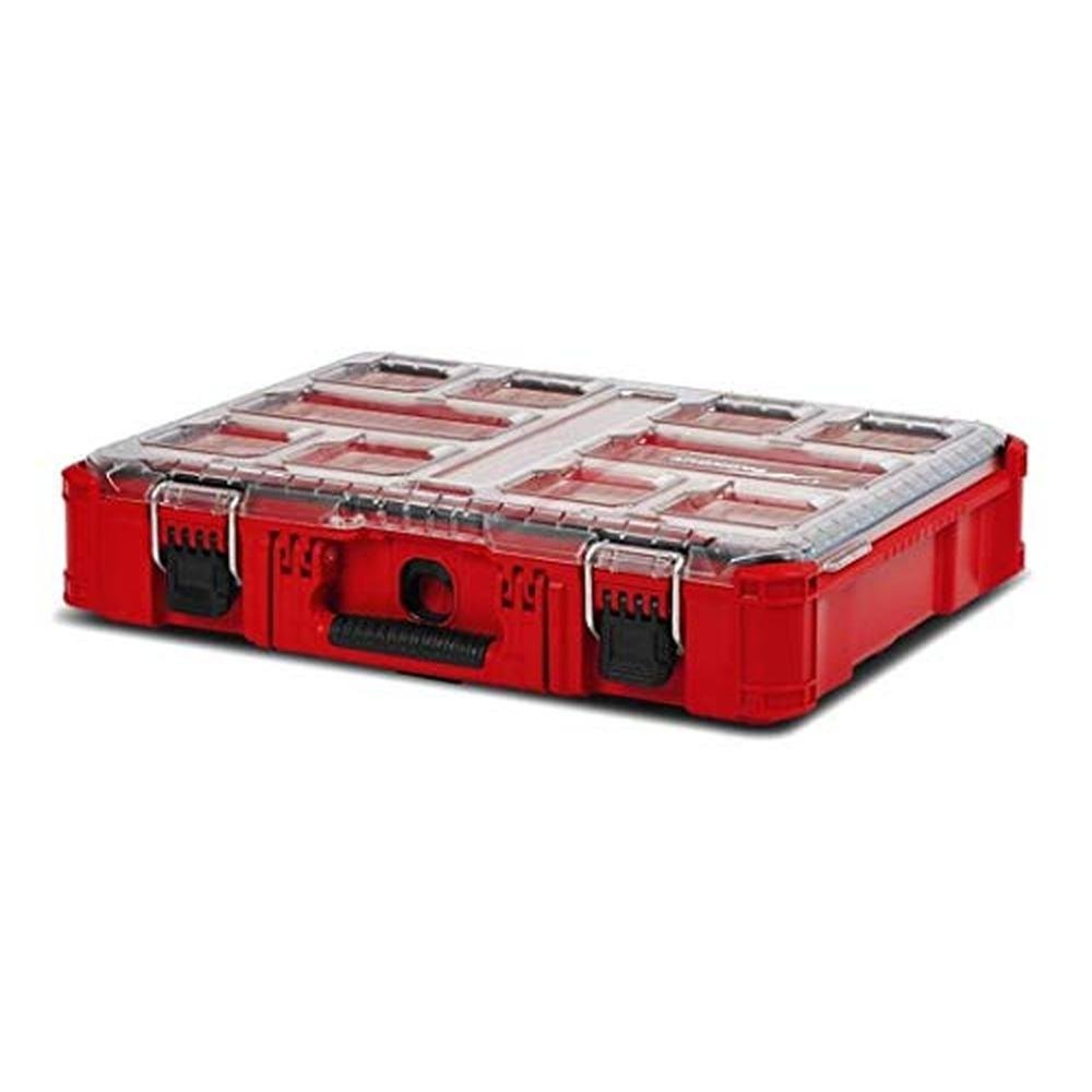 Pack out, 11 compartment, small parts organizer, compatible with all pack out Modular storage products, IP65 rated weather seal, no-travel bins seal prevent small part migration between bins, clear top for easy identification of contents, integrated center slot for long bits & blades, integrated screw slots on the back of the bins allow them to be mounted to the wall, Heavy duty latches, reinforced hinge, includes: 2 XL removable bins, 8 large removable bins & 1 Built in for long accessories. Pack out, 8 large removable bins & 1 Built in for long accessories.